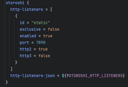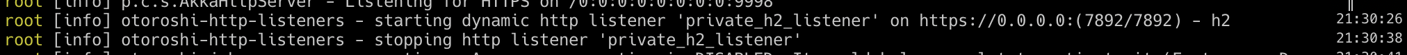 you can start an http listener right from the otoroshi config. file. To do so, just add an http listener config. at otoroshi.http-listeners. You can also provide the full HTTP listener json formatted config. array in the OTOROSHI_HTTP_LISTENERS env. variable.