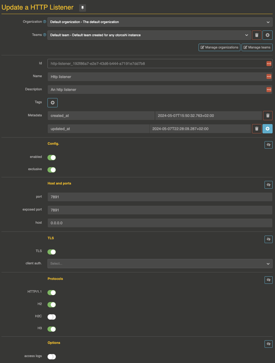 the API is available at http://otoroshi-api.oto.tools:8080/apis/http-listeners.extensions.otoroshi.io/v1/http-listeners/:id. As soon as you create a new entity, the corresponding listener will be started. If you modify it, the listener will be restarted. If you delete it the listener will be stopped.